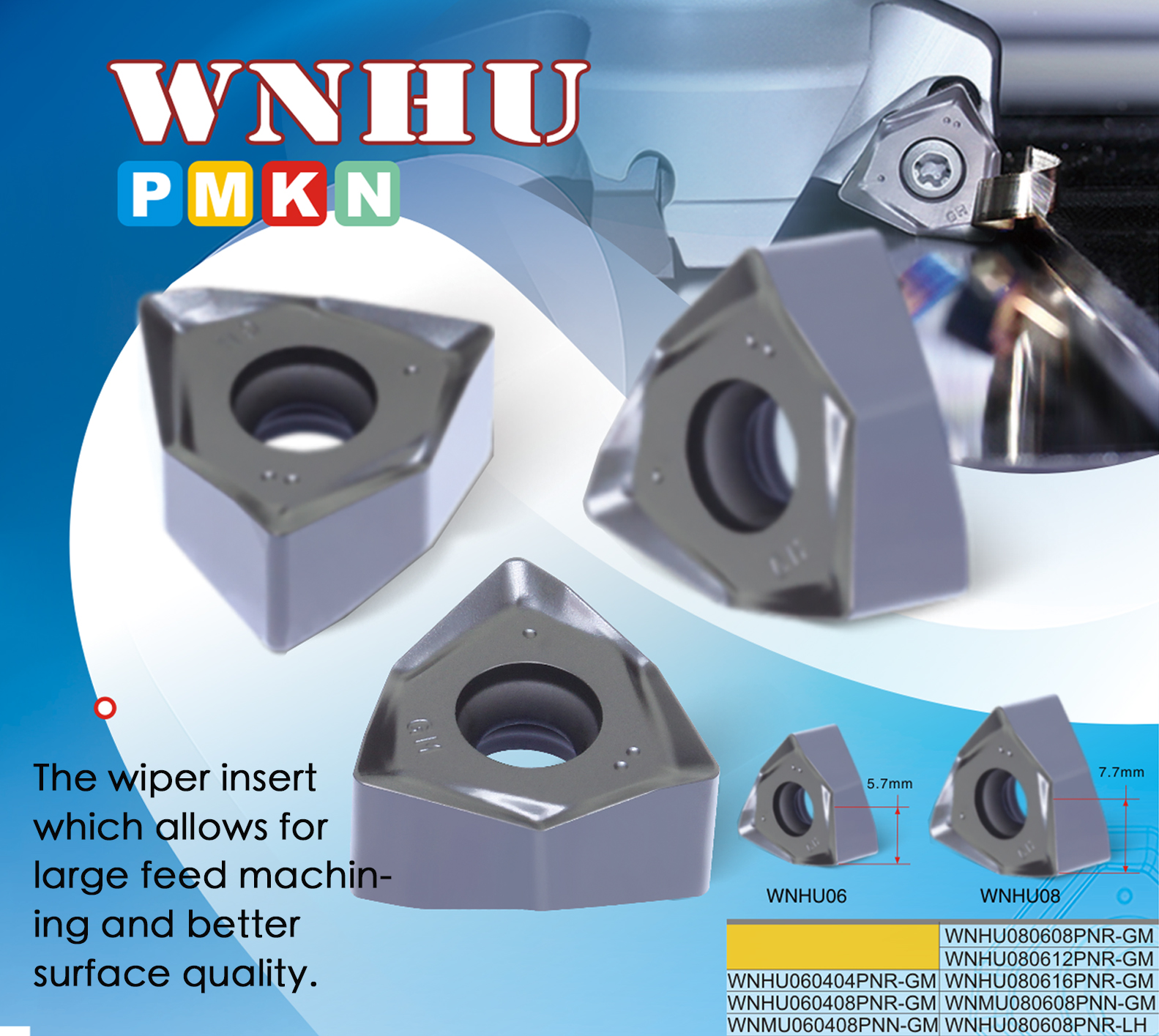 The insert with wiper allow for goodsurface quality. Full size specifications and geometry typesmeet the requirements of different cutting depths and other machining needs.