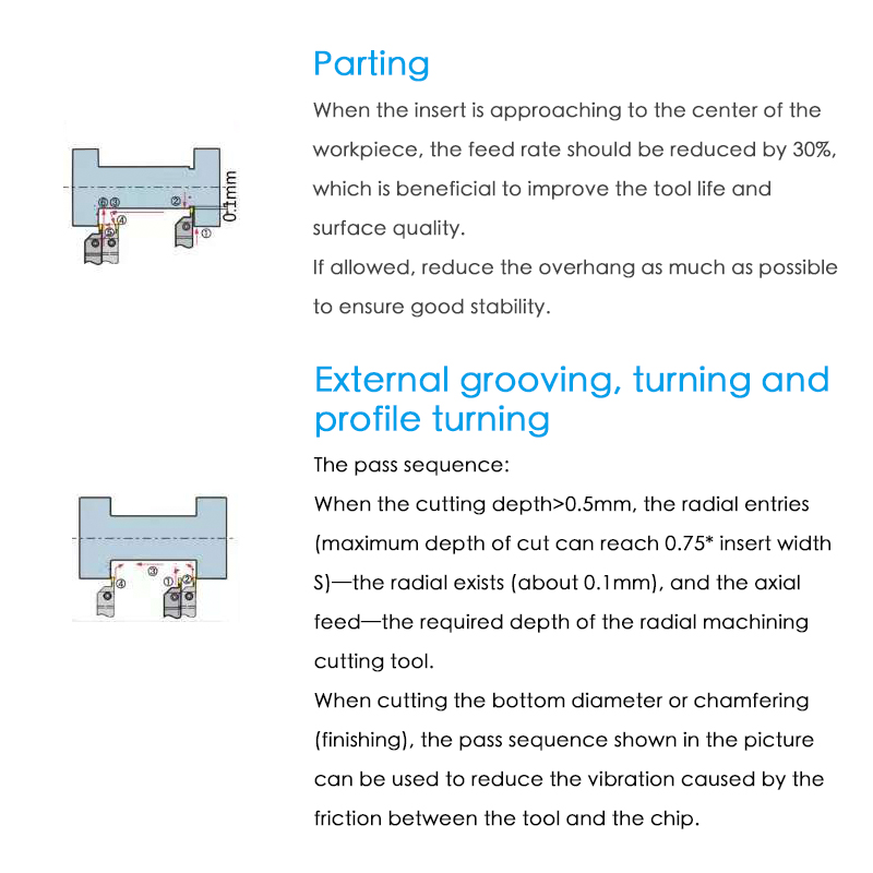 When the cutting depth>0.5mm, the radialentries (maximum depth of cut can reach 0.75* insert widths)—the radial exists(about 0.1mm), and the axial feed—the required depth of the radial machining cutting tool.