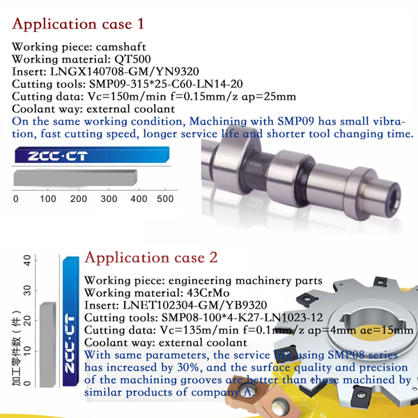 On the same working condition, machining with SMP09 has small vibration, fast cutting speed,longer service life and shorter tool changing time.
