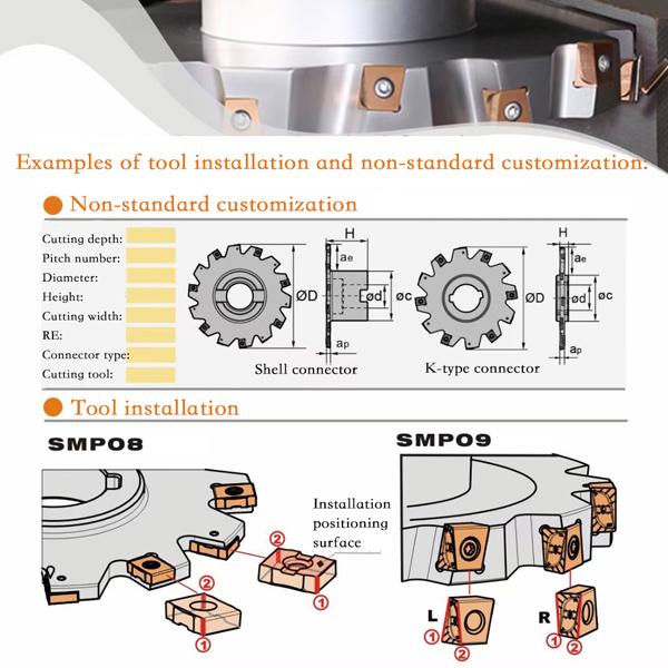 The cutting tool includes key connection and mandrel connection, which can be usedfor slot milling, down milling, parting, face milling and side milling.